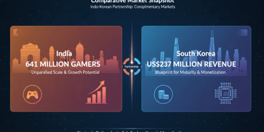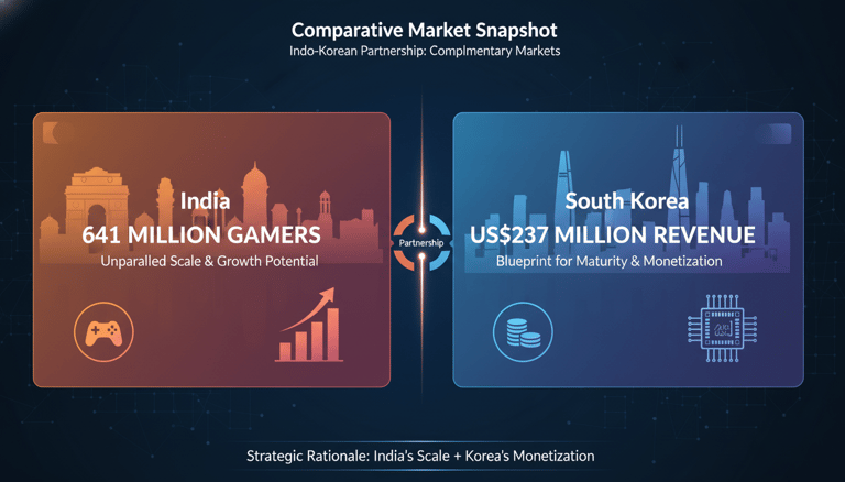 Strategic Rationale: India's 641.2 million gamers and $140M market (2027) provide scale and audience reach. South Korea's $237.3M mature market (2030) offers monetization expertise, infrastructure blueprints, and talent development frameworks. Together: a $377M+ ecosystem with exponential growth potential.