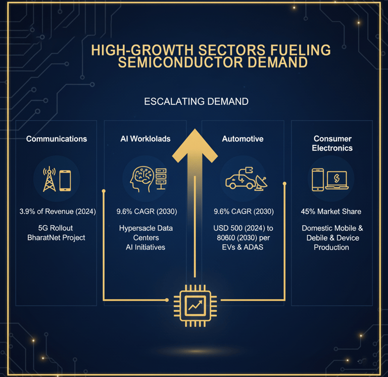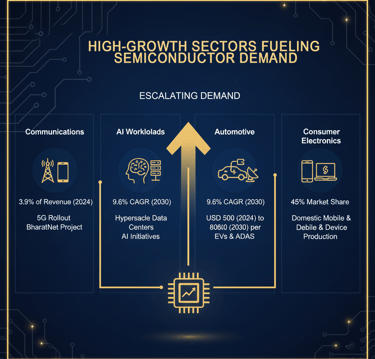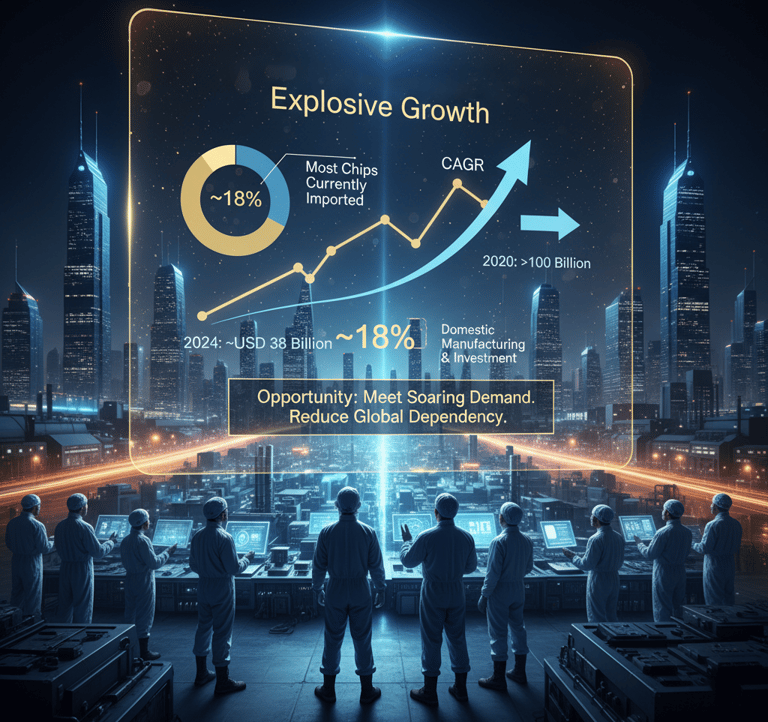 India's semiconductor market is on a trajectory of explosive growth, with forecasts projecting an expansion from as low as USD 38 billion in 2024 to as high as USD 105 billion by 2030, representing a compound annual growth rate (CAGR) of approximately 18%. Other estimates project growth to USD 103.4 billion from a 2024 base of US$ 52 billion. This surge creates a massive domestic capture opportunity, as the country currently imports the vast majority of its chips..