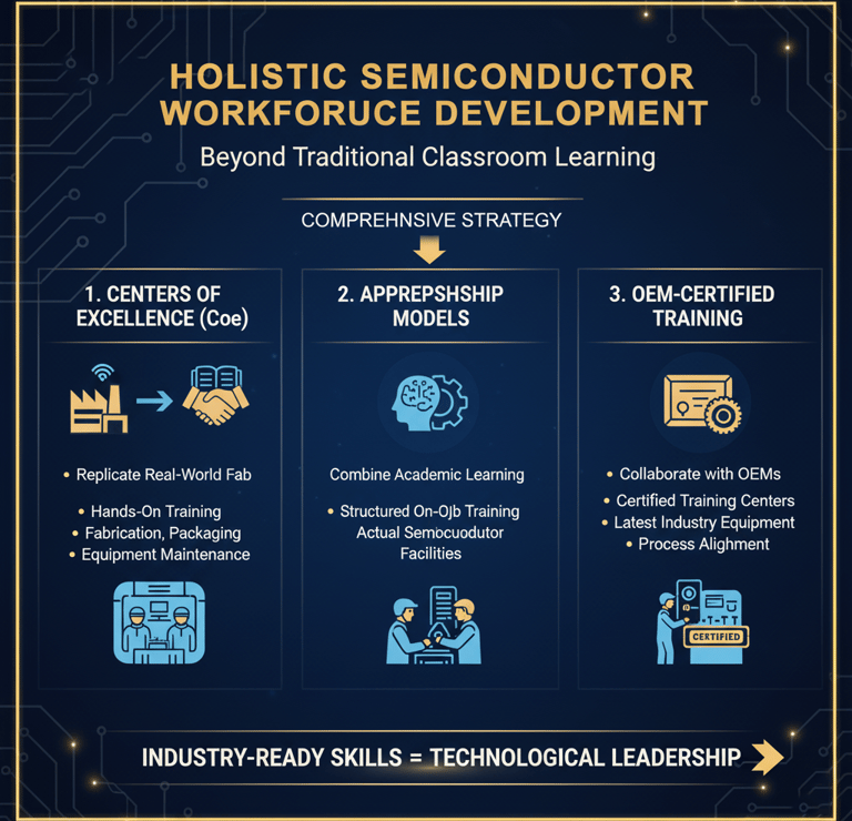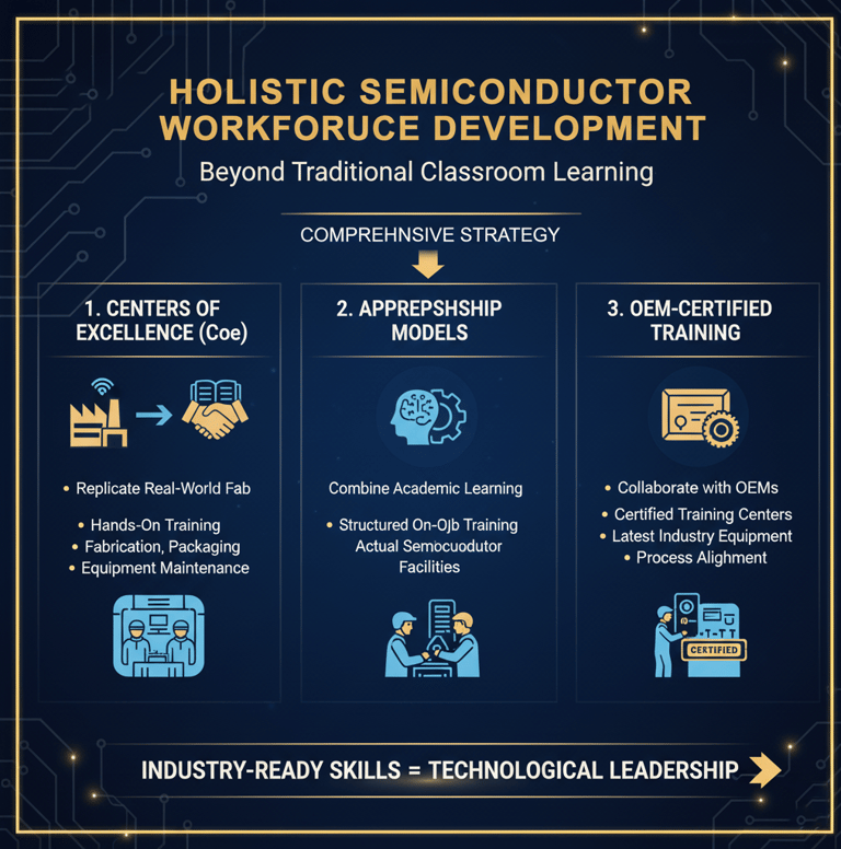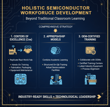 Centers of Excellence (CoEs): Establishing CoEs that replicate real-world fab environments for hands-on training in fabrication, packaging, and equipment maintenance.