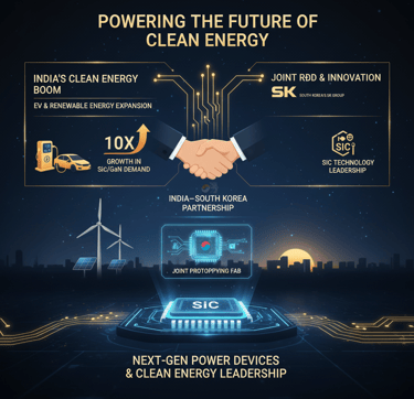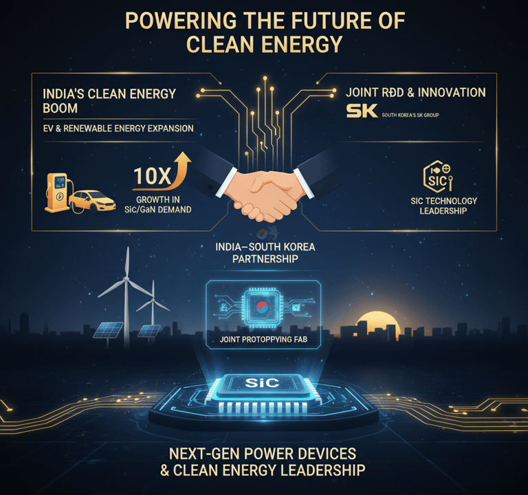 India's push for electric vehicles (EVs) and renewable energy is creating massive demand for wide-bandgap (WBG) semiconductors like Silicon Carbide (SiC) and Gallium Nitride (GaN). 1 South Korea's SK Group has significant capabilities in the SiC market. A joint R&D and prototyping fab for these next-generation power devices would allow the partnership to leapfrog into a high-value, high-growth market segment.