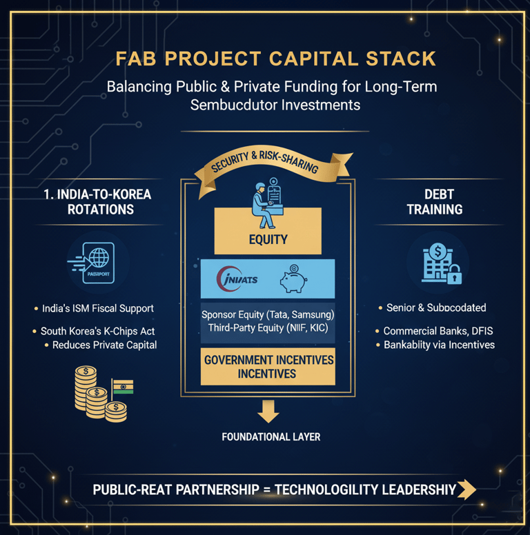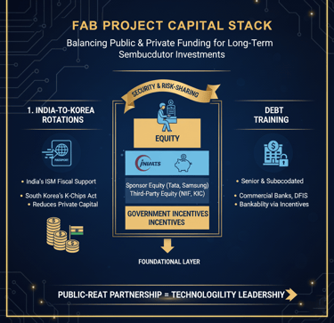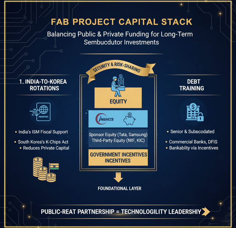 Government Incentives: This forms the foundational layer, comprising direct fiscal support from India's ISM and tax credits from South Korea's K-Chips Act. This layer significantly reduces the total capital required from private sources.